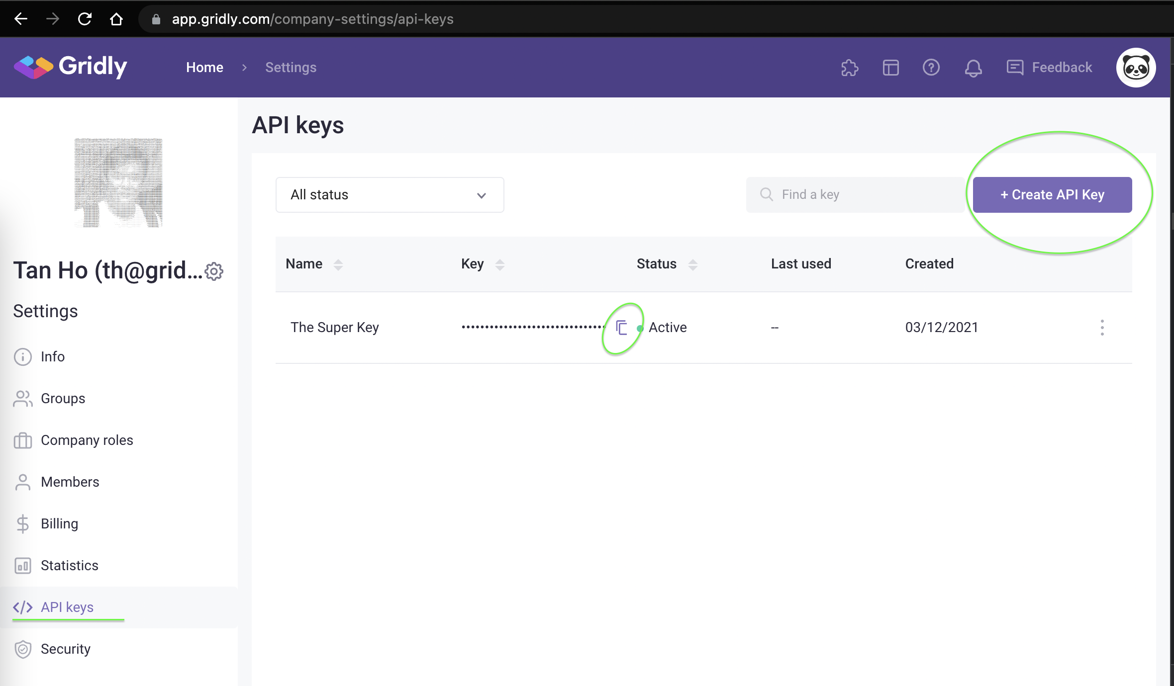 1. To quickly get your API key, access your Gridly Dashboard, then select a Grid View and you can find the key in API quick start right panel. img.png